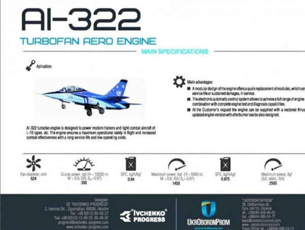 ?據烏克蘭媒體報道,烏克蘭馬達-西奇公司已經簽署了一份合同,將向中方供應400臺AI-322型渦輪風扇發(fā)動機,合同的總價值約為8億美元,中航國際控股公司是簽約的進口商。AI-322發(fā)動機被選定為中國研制的L-15高級教練機的動力系統(tǒng)。毫無疑問,中國這8億美元“雪中送炭”的輸血訂單,又可以讓烏克蘭馬達西奇公司得以續(xù)命很久了。